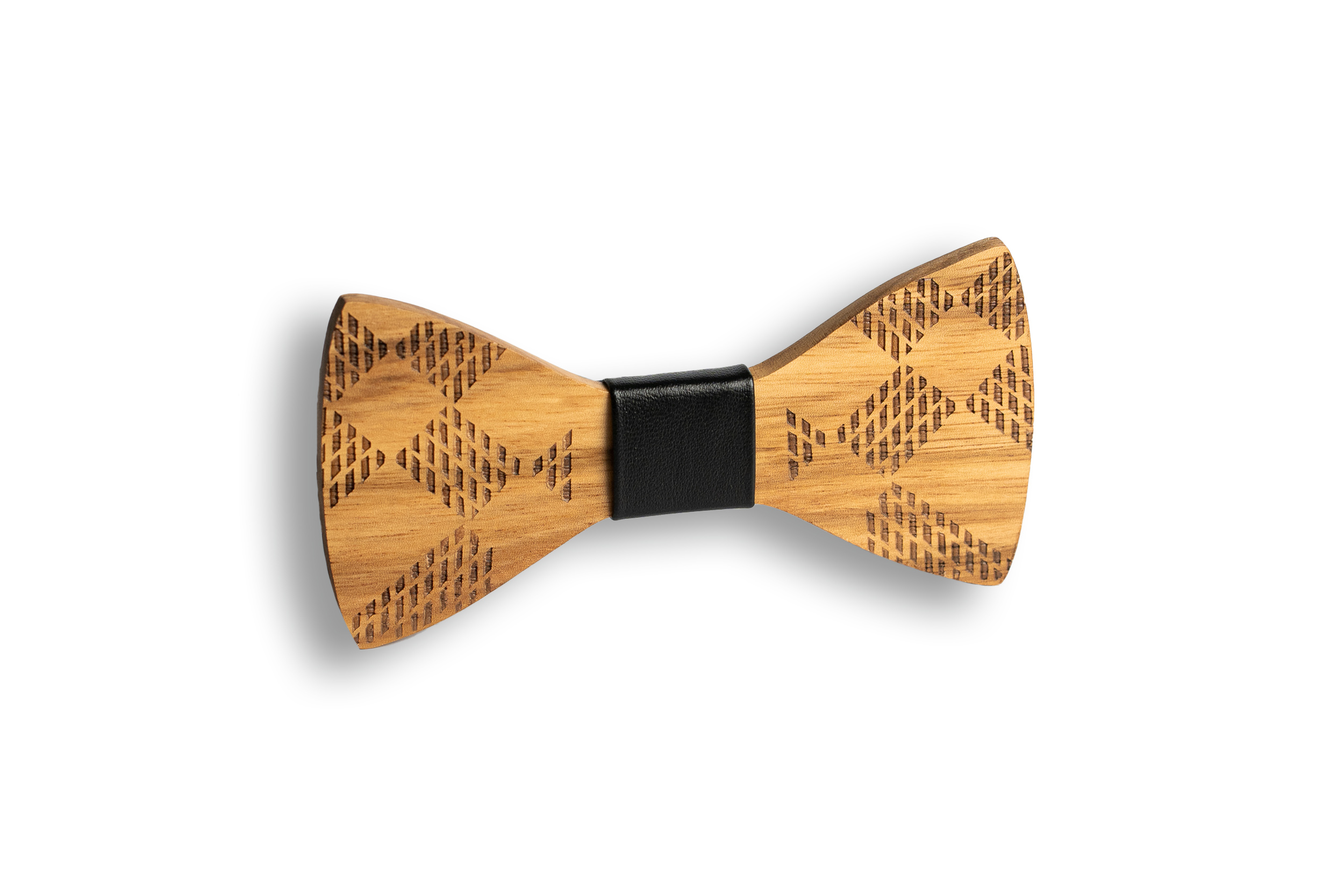 Tyylikäs puinen rusetti mustalla nahalla.